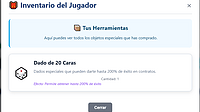 Shop & Inventory Open Shop (๐) to purchase special items Item available: Dado de 20 Caras (20-sided die) โ price $50,000 Purchases update UI live and are persisted Open Inventory (๐) to view q...
